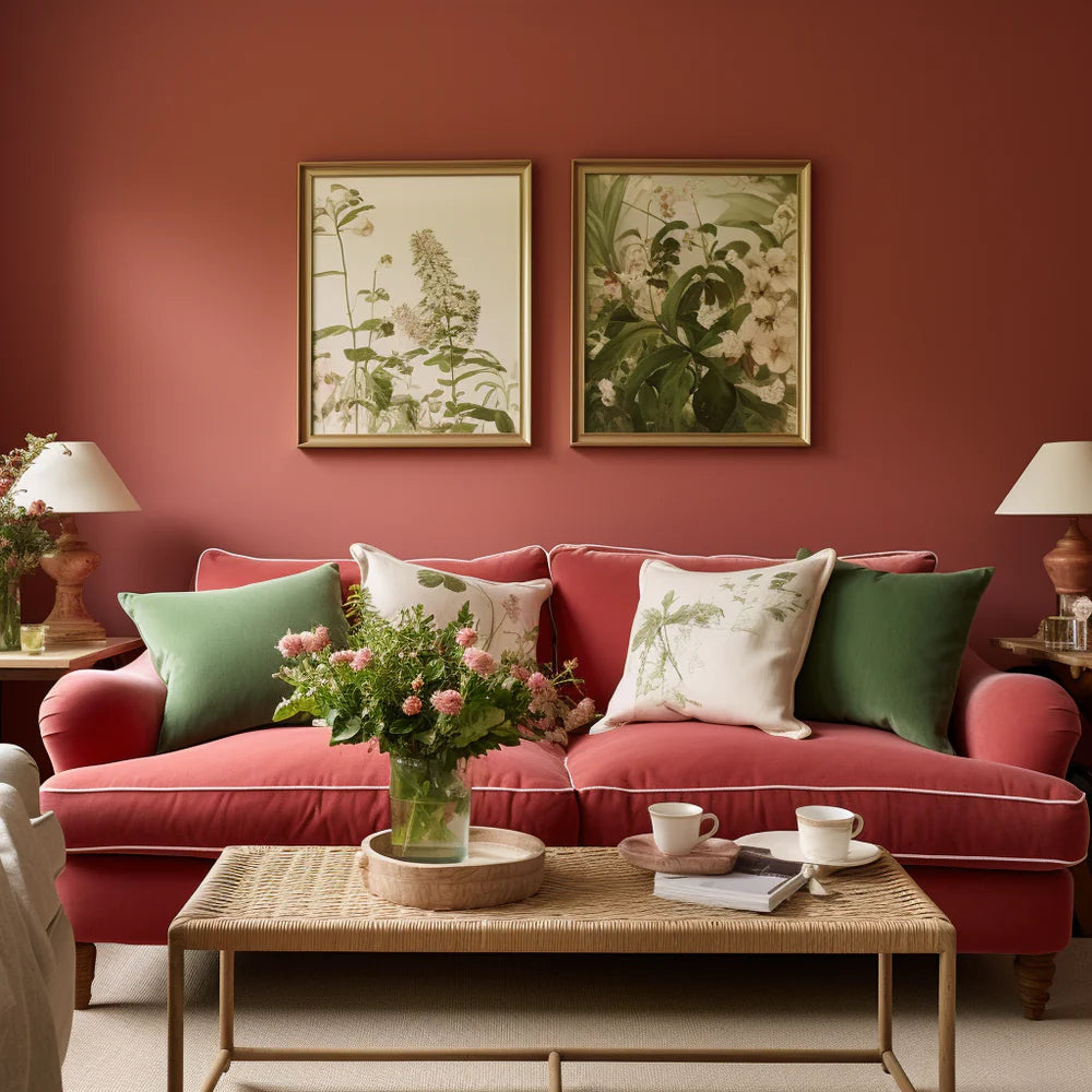 Blossoming Green Cushions and Floral Cushions on a Red Sofa
